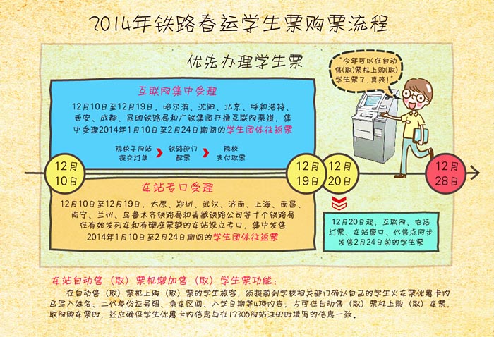 为了方便学生购票、取票,铁路部门将在自动售(取)票机上提供售(取)学生票服务。一是车站设置的自动售(取)票机均增加售(取)学生票功能;二是在部分规模较大的院校,经学校同意后,逐步设置自动售(取)票机,方便学生购(取)票。