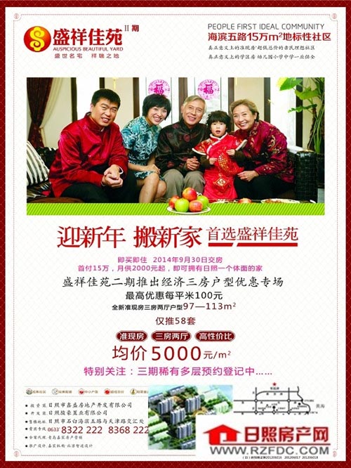 迎新年,搬新家,首选盛祥佳苑。即买即住,2014年9月30日交房,首付15万,月供2000元起,即可拥有日照一个体面的家。