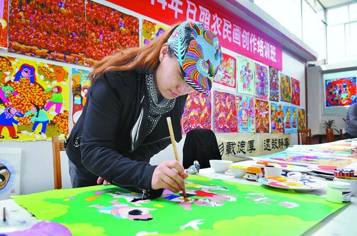 4月23日,一名高校教师在创作农民画。近日,由市美术馆举办的“美术乡村(社区)行”2014年日照农民画创作培训班在山海天旅游度假区桃花岛风情园开班。据了解,本次参加培训的人员有新老作者、大中专高校老师20余人,准备筹备创作农民画作品80余件,创作的部分作品将为今年的全国美术馆馆藏精品展季活动做准备。
