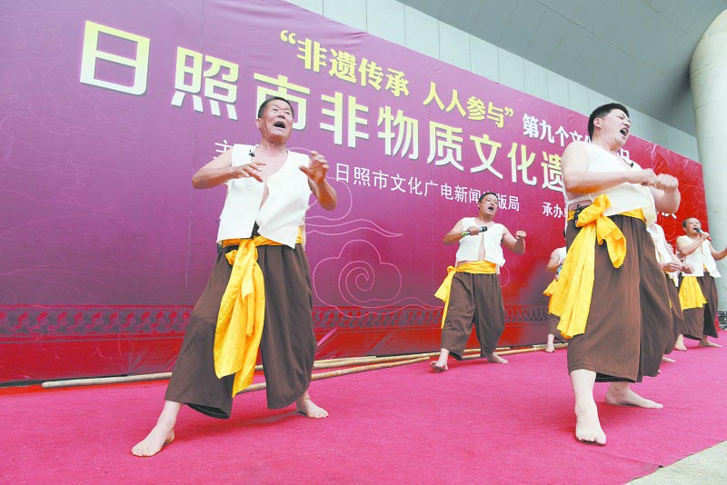 6月14日,演员在表演“渔民号子”。当天,在日照博物馆广场,我市举办非物质文化遗产采风图片展及特色非遗项目展演,迎接我国第九个“文化遗产日”。2014年文化遗产日的主题是“让文化遗产活起来”。具有“海洋特色”的“渔民号子”、“水族舞”等日照特色的节目,深受群众喜爱,展示了丰富的非物质文化遗产,营造了“非遗传承,人人参与”的良好氛围。