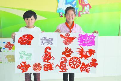 6月23日下午,五莲县洪凝小学剪纸社的同学正在展示自己的剪纸作品。在剪纸社,一张张彩色的纸,在孩子们一双双灵巧的手中变成了栩栩如生的小动物、壮丽的河山美景……