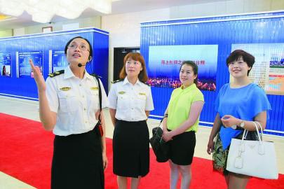 7月7日,在岚桥锦江大酒店的21世纪海上丝绸之路展览上,日照海事局的工作人员正在做讲解训练。 中国航海日论坛即将在日照召开,21世纪海上丝绸之路展览、海员公益展览、中国引航文化品牌建设巡礼展览3个各具特色的展览正在紧张布展,各展区的讲解员也在熟悉讲解内容,以最好的状态迎接来自世界各地参加论坛的宾客。