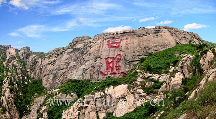 河山山势峥嵘,气势雄伟,遍布古迹,处处胜景,使游人大有登泰山之感。代表日照现代形象的巨书“日照”两字刻于河山悬壁之上。“日”字长20米,宽17.5米;“照”字长25米,宽25.5米。它是汉字摩崖石刻的世界之最,载入世界吉尼斯大全,给河山增添了一大景观。在摩崖石刻附近几百米处,山峰组成了一位壮硕男子的上半身像,传说这就是太阳神的神像。在山峰东侧,新修有900余步长的木栈道,险峻异常。