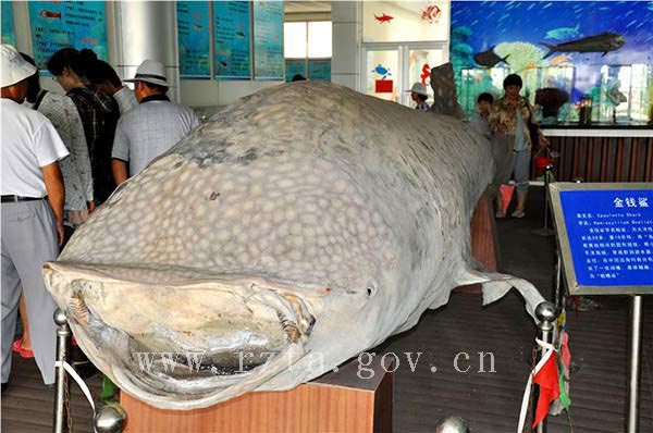 海洋生物馆里的金钱鲨标本。海洋生物馆利用五座太阳塔中的第三座设计建设,以鱼、虾、蟹、贝、藻等分类展示千余种海洋生物。