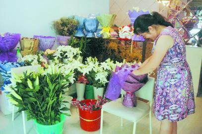 7月31日,在黄海二路一花店老板穆志琴正忙着整理店里的花束,为七夕情人销售高峰到来做好准备。 七夕情人节临近,很多花店都打出了预定的广告和标语,记者发现很多花店现都摆满了玫瑰、百合以及包装好的花束。据花店老板穆志琴介绍,因为“七夕”临近,百合、玫瑰等很多花的价格都比平时有所上涨,但订花的人数几乎是平时的10倍。