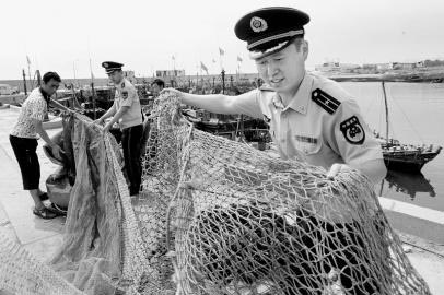 8月26日,青岛小口子公安边防派出所“开渔服务队”在连心渔港码头帮渔民整理渔具准备装船。 2014黄渤海伏季休渔即将结束,山东省渔业、公安边防等部门联合执法,深入渔港码头,通过集中宣讲、发放资料、签订责任状等方式,向渔船民宣传海上治安、反偷渡反走私、安全生产等法律法规,确保秋汛渔业生产安全有序。2014年度北纬35度以北的渤海和黄海海域伏季休渔时间为6月1日12时至9月1日12时,渔业辅助船与捕捞渔船同步休渔