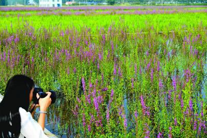 8月26日,在莒县刘官庄镇柳青河人工湿地,游客在欣赏千屈菜。该湿地是我市第一块兼具潜流、表流系统的人工湿地,也是目前全省最大的纯人工湿地工程,日处理废水8万吨。