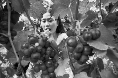 市民在东港区三庄镇吉洼村的葡萄观光采摘园采摘葡萄。 东港区三庄镇吉洼村近年来经过市场调研,引导村民种植葡萄,打造小而精的观光采摘园。2013年成立葡萄专业合作社以来,葡萄种植面积已发展到近200亩,逐步受到当地及周边游客青睐。