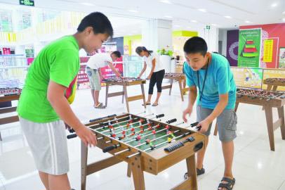 近年来,东港区围绕满足群众健身需求这一根本宗旨,不断加强基层体育组织建设,广泛开展全民健身活动。今年7月中旬,河山镇体育总会成立,成为山东省第一个乡镇级别的基层群众体育组织。 据了解,为满足更多群众对健身的需要,东港区已投资400余万元,为9个镇街道的220个村居安装了健身器材。图为近日,在凯德广场,市民们正在体验桌上足球的乐趣。