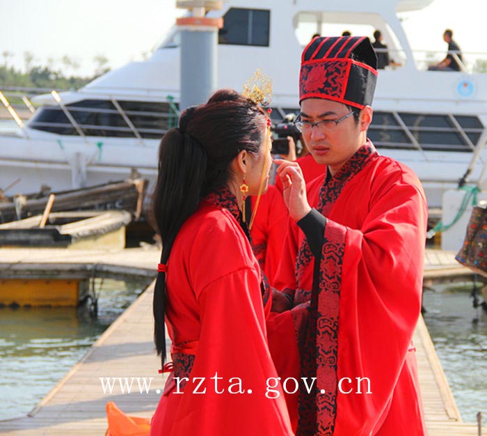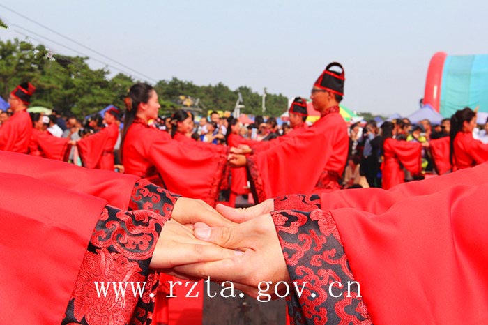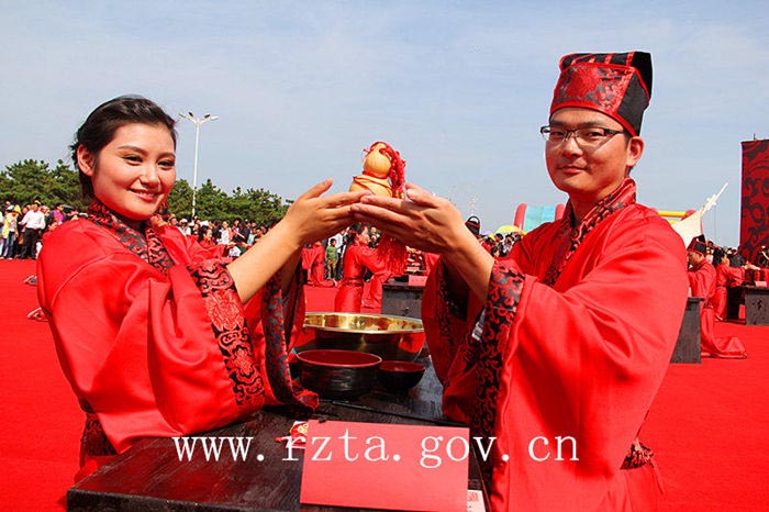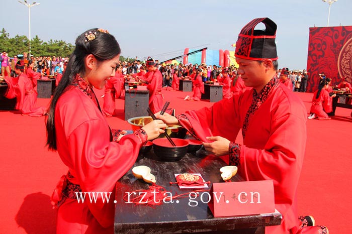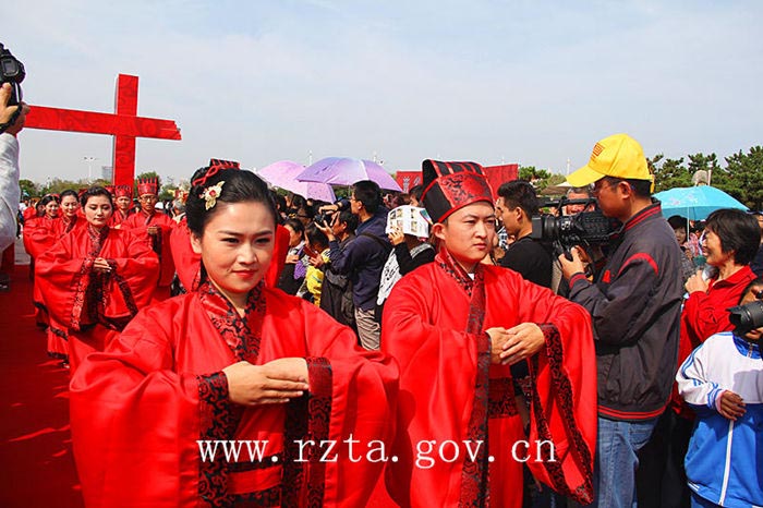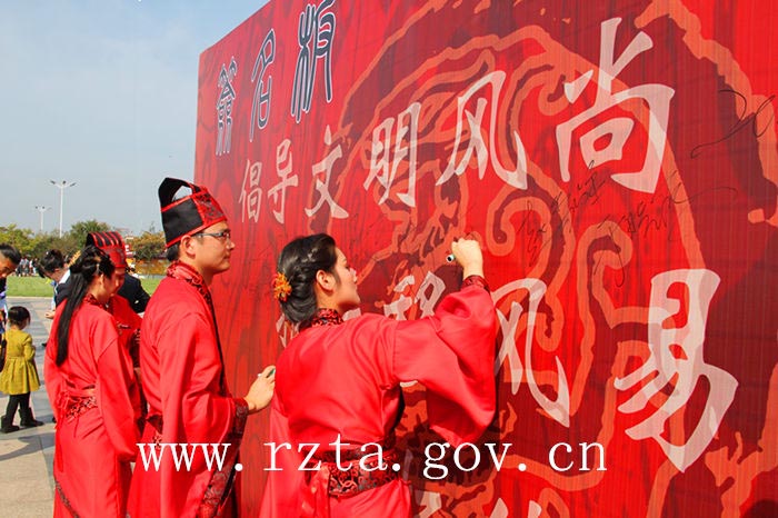 自2003年以来,日照市青年集体婚礼已经成功举办了11届,活动以其简约、时尚、文明的风格得到了社会各界的广泛关注,受到了广大青年的欢迎。今年,日照市首次通过汉礼的形式来举办集体婚礼,本届集体婚礼的宗旨是“倡导文明风尚,推进移风易俗,弘扬传统文化”。婚礼开始前,18对新人和万平口风景区的各地游客在签名墙上签下了自己的名字,表达对文明风尚和传统文化的推崇。
