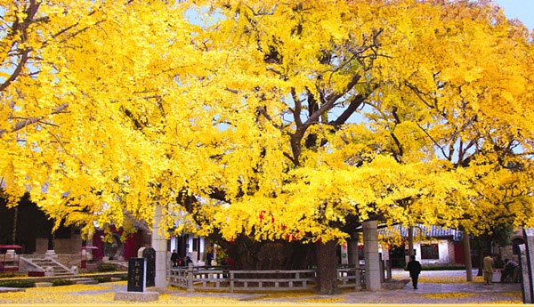 秋分已过,正是秋意渐浓时,在这果实丰硕、多彩多姿的秋天,不出门看看似乎有点愧对秋色。 莒县浮来山定林寺内那一颗有着5000年树龄的天下银杏第一树,应该会是我们赏秋的不二选择。秋风一起,银杏染秋,扇子般的银杏树叶一夜换上金黄色的衣衫,或挂枝头,或随风飘舞,或躺地上。清晨和黄昏,阳光透过金色叶子,照耀在这颗枝繁叶茂的古树上,景色让人陶醉,会不知不觉为它的灿若黄金的奇特景观所征服!