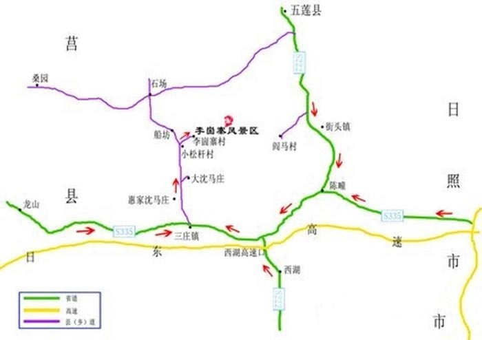1、从日照沿着S335西行至陈疃镇转S222至街头镇再转李崮寨,约30公里。