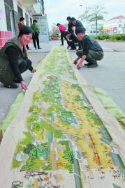 10月29日上午,在山海天旅游度假区两城街道,52岁的村民于培升正在展示十字绣《清明上河图》。 据了解,十字绣《清明上河图》全长22米,在过去的3年里,于培升利用闲暇时间完成了一半,他计划再用3年时间完成剩余部分。