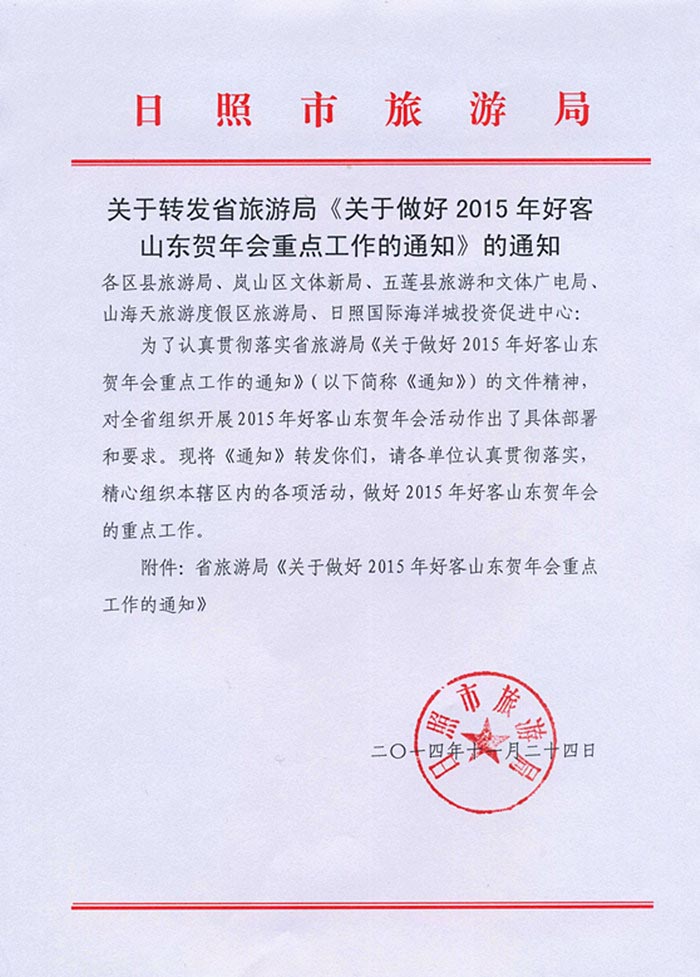 关于转发省旅游局《关于做好2015年好客山东贺年会重点工作的通知》的通知(2014年11月24日)