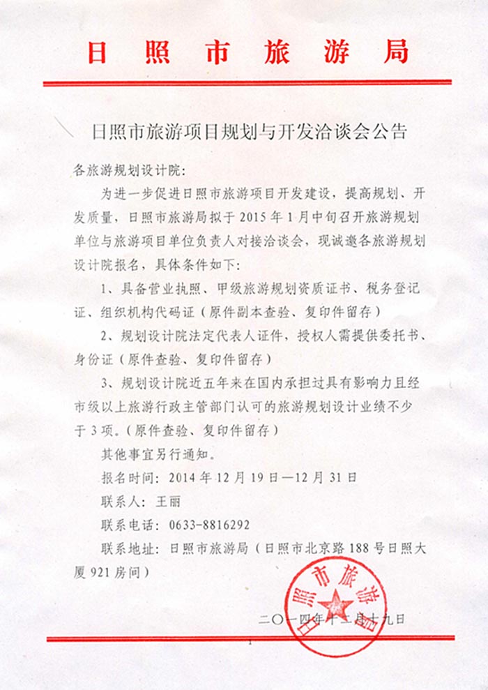 日照市旅游项目规划与开发洽谈会公告(2014年12月19日)