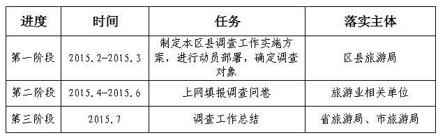 (一)市旅游局负责全市调查工作的组织部署,各区县旅游局制定本地区调查工作实施方案,组织安排调查工作,落实督促相关单位参加调查。各区县要指定专人具体负责此项工作,并请将联系人信息(姓名、办公电话、手机、电子邮箱)于3月12日前发送至邮箱rzhypxk@126.com。