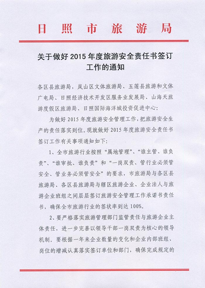 关于做好2015年度旅游安全责任书签订工作的通知(2015年04月23日)
