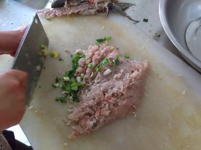 用刀背给鲅鱼“松骨”,这种方法做出来的鲅鱼馅儿要鲜嫩很多。