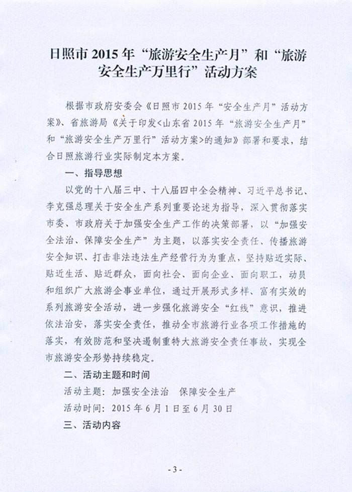 关于印发《日照市2015年“旅游安全生产月”和“旅游生产安全万里行”活动方案》的通知(2015年06月05日)