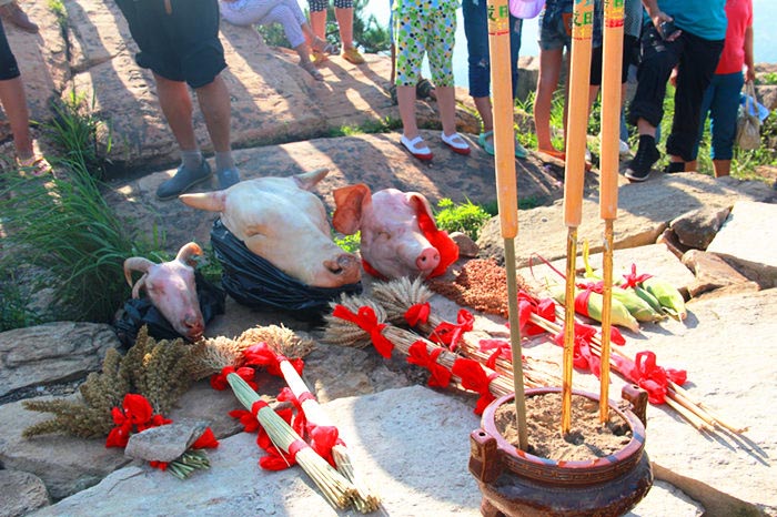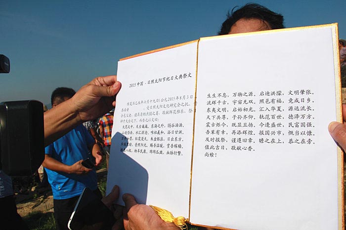 8月3日(农历六月十九日)早上日月同辉。地处日照海洋城涛雒镇下元村的天台山上,“焚香奠礼”、“宣读祭文”、“太阳文化研讨”热闹非凡。市内外数百名太阳文化研究爱好者和下元村村民自发地来到天台山顶,举行了“2015日照第六届太阳文化祀日大典”民俗活动,按照民间习俗为太阳神庆贺生日。