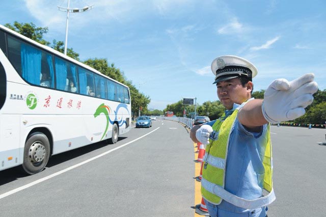 完善交通基础设施。对市区信号灯、标识线、护栏等交通设施进行经常性维护,并根据车流量变化进行精细化调整。协调有关部门和沿海民俗旅游村居,对现有停车场重新规划设计,新建、扩建,有效缓解停车压力。5月份以来,市区新建停车场16处,车位增至13600个,新安装交通隔离护栏36千米、各类交通标识126面。重点整治“举牌揽客”、“占道经营”。部分商贩、经营业主在市区主干道两侧占道经营、举牌揽客,造成极大安全隐患,损害旅游城市形象。按照市政府要求,7月下旬以来,我市警方会同城管执法、工商及街道(村居)等部门,通过宣传教育、劝导、强制清理、行政处罚等手段开展联合整治行动,目前,共发放《致我市旅游从业者的一封信》1200余份,签订承诺书350余份,纠正举牌揽客、占道经营行为1293起,处罚违法行为20余起。整治行动取得初步成效。全员上路确保畅通。屯警街面、路面,全面引流疏堵,确保畅通。在沿海景区车流人流密集区域,通过实行外围控制、内围疏导、间隔放行与警车引导等措施,确保高峰时车流平稳通过。同时,开展拉网式排查整治行动,严查酒驾、超速、超载等违法驾驶行为,并制定预案积极推进三轮车治理工作。自5月份以来,在主干道、景区共查处交通违法行为2363起,暂扣违法车辆196台次,进一步净化了沿海道路交通环境。