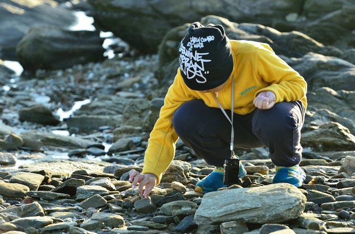 跟随孩子的视线会发现在礁石间有许多参差不齐的小水洼,他们用他们与生俱来的童真而又好奇地目光注视着水洼里形形色色的小海洋生物,这里属小螃蟹最引人入胜。