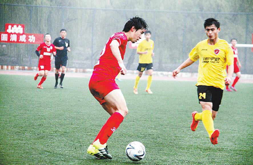 11月21日、22日,2015年山东省足协杯赛在日照举行,代表日照参赛的日照宇启足球俱乐部队在首场比赛中以3:2淘汰淄博星期天队,随后在22日的比赛中又以2:0的比分力克潍坊伯纳乌队,挺进将于28日举行的决赛,如果夺冠将获得下一年中国足协杯赛的参赛资格。图为队员在比赛中。