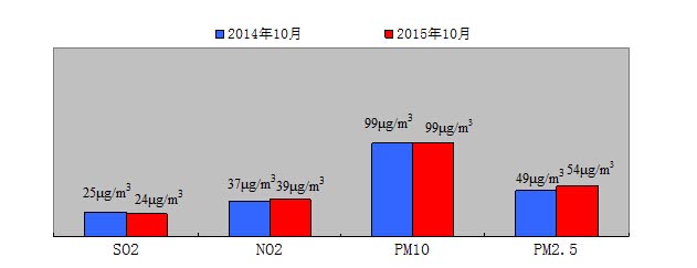 全市二氧化硫、二氧化氮、PM10、PM2.5浓度分别为24微克每立方米、39微克每立方米、99微克每立方米、54微克每立方米,所代表的空气质量均位居全省第4位。较上年同期,二氧化硫浓度下降了4%,PM10同比持平,但是受区域污染物传输及雾霾、静风、逆温等不利气象条件影响,二氧化氮、PM2.5浓度分别上升了5.4%、10.2%。