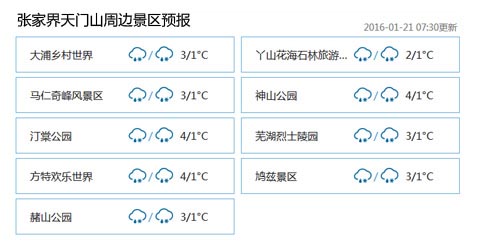 1月21-22日,天门山景区以小雨及雨夹雪天气为主,温度将降至到4摄氏度左右,天气寒冷,外加雨雪相伴,游客朋友们除带好雨具外,更要及时添加保温衣物。同时,在景区游玩,在室外活动的时间会较长,可以选择一些防滑保温的鞋子穿着,如:登山鞋,雪地靴...