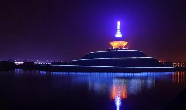 潮汐塔高42米,塔体呈透明状,中部设有外伸观景平台,平台外面装饰莲花瓣形金属网,部分构架节节收缩,宛若莲花盛绽之态。潮汐塔主体用红蓝两色表示潮汐的高低,当蓝色灯柱上升时,表示正在涨潮,灯柱全部变为蓝色表示最高潮位;当红色灯柱下降时,表示正在落潮,灯柱全部变为红色表示最低潮位。