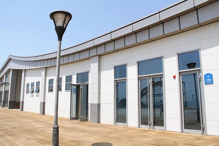 它们采用了环保理念,屋顶设有太阳能电池板,连续阴雨天一周内,能保证整个板房正常照明,电量不足时,可自动切换为市电负载供电的发电设备。主要用作广场游客服务中心、特色旅游纪念品售卖等服务。