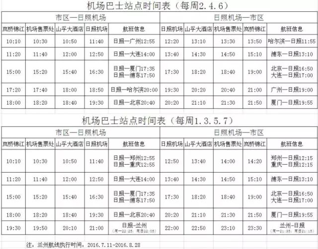经多方联系有关航空公司,结合暑期市民出行实际需求,在2016年夏秋航季(2016.3.27-2016.10.29)季中,日照机场将于7月11日至8月28日,将开通由中国东方航空执飞的兰州=日照暑期旅游加班航线,每周一、七执行(具体航班时刻见2016年夏秋航季航班时刻表)。