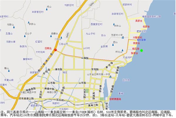 自驾游:同三高速日照北-山海路-青岛路左转-青岛178KM(路标)右转500米左右左侧即是。(碧海路也叫北沿海路、沿海路)