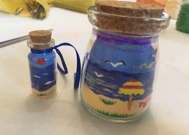一个玻璃瓶,一堆七彩岩沙,一双巧手,再加上孩子天马行空的创意,勾画着他们内心的童话世界,绚丽多彩。不少小朋友表示玩的特别开心,跟爸爸妈妈度过了一个欢乐的周末,还学到自己制作沙瓶画,特别有意义。