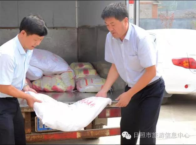 日照旅游发展委员会派驻东港区陈疃镇堰村第一书记匡伟(右)和日照华美酒店总经理刘安邦(左)为村民送去米面