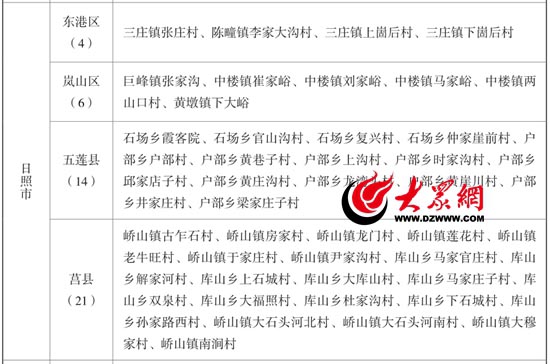 45个村中,莒县最多有21个;五莲其次,有14个;岚山6个;东港4个。