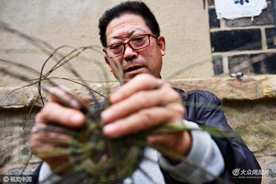 2016年10月18日,山东省日照市东港区后村镇高家沟村,67岁的退休教师高加兴平时爱好藤编,他利用本地常见的野生小葛藤编制果盘、花篮等葛编制品,出于兴趣爱好赠送同事和好友。图片作者:陈为峰/视觉中国