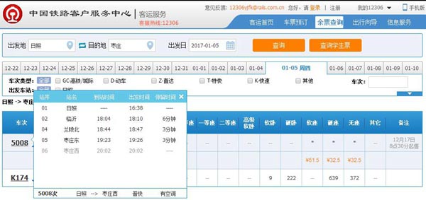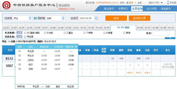 1月5日日照至枣庄火车票 12月17日8点30分起售(2016年12月13日)