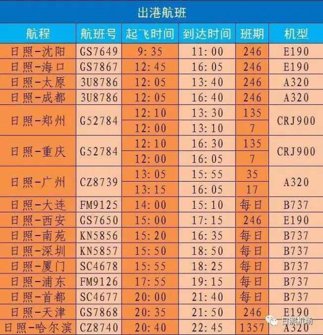 日照机场2016/2017年冬春航季航班时刻表