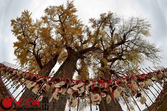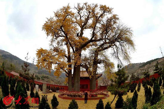 在距小村数公里之外,人们一眼就能看见这傲然挺立的银杏树。最大的树高30米,胸围2米,冠幅20米,东西冠幅18米,南北冠幅22米,5人张开双臂也无法合抱。穿过寺院的三殿就是千年银杏树,两株银杏树犹如一对雄狮,威武地守在小村寺院内。游客用红绳将银杏树围起。苍劲的枝桠上,挂满银杏枝叶。这两株银杏树曾是小村588户村民的记忆,见证十几代人的生活。