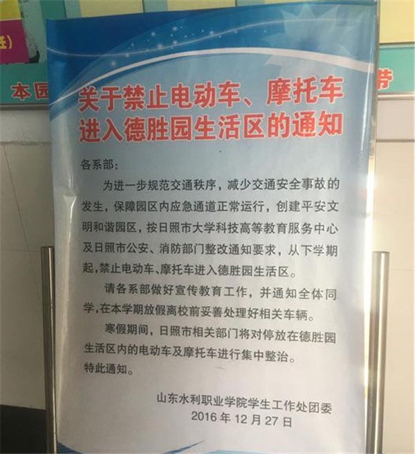 关于大学生“禁驶电动车摩托车”的措施酝酿已久,2016年12月中旬就已经在曲师大日照校区等高校执行,根据学校规定:“为了保证学生的交通安全、用电安全,经讨论研究决定,禁止学生骑行电动车,并将这规定列为校规校纪的一项重要内容之一。”目前,在曲师大日照校区校园内已经基本没有电动车、摩托车的踪迹。