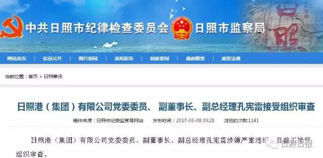 1、日照港高层又有一人接受组织审查 3月8日,日照市纪委监察局网站发布消息:日照港(集团)有限公司党委委员、副董事长、副总经理孔宪雷涉嫌严重违纪,目前正接受组织审查。