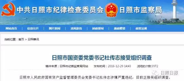 2016年12月29日,日照市纪委监察局网站发布消息:日照市人民政府国有资产监督管理委员会党委书记杜传志涉嫌严重违纪,目前正接受组织调查。