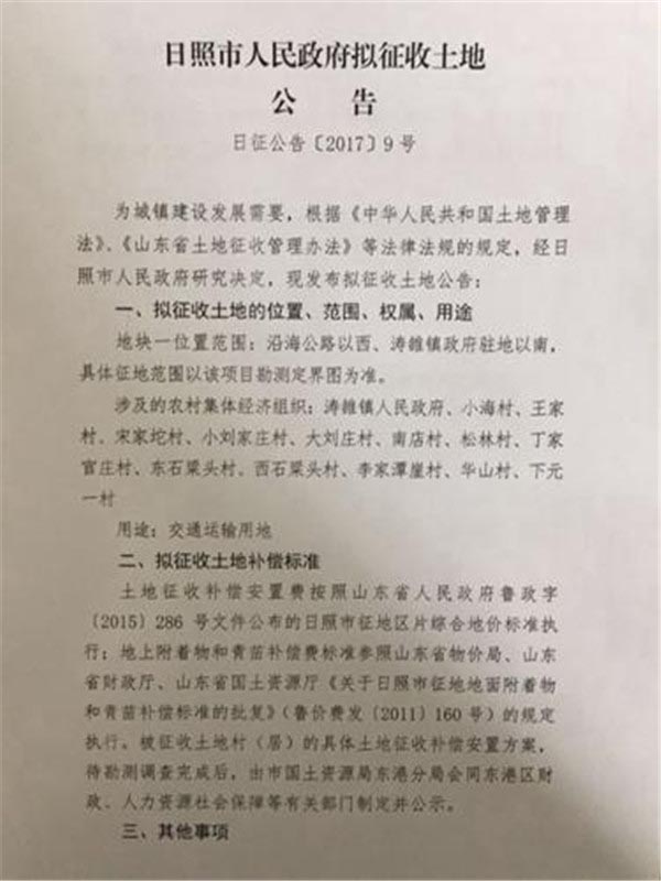 日照政务网发布三项拟征收土地公告,用途为教育用地、交通运输用地和风景名胜设施用地。