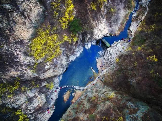 瀑布在山石中倾泻而下,溪水碧波微荡,春天,峡谷两岸开满了迎春花,奔流而下的瀑布,颜色鲜亮的游人从一侧悠然而过,这何止是一曲美妙的山水交响乐,同时也是一副曼妙的自然山水精品画廊。