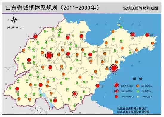 到2030年,城区人口500-1000万的特大城市有济南、青岛;300-500万的I型大城市有淄博、烟台、临沂;100-300万的II型大城市有枣庄、东营、潍坊、济宁、泰安、威海、日照、德州、聊城、滨州、菏泽;50-100万人的中等城市26个,50万人以下的小城市58个;10万人以上的建制镇20个左右,5-10万人的建制镇60个。