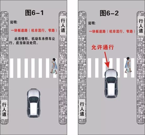 六张图片中的行人都是已经进入人行横道行走的,相邻车道的机动车应当停车让行,符合法律规定。就是说如果在机动车行驶的方向前,行人已经进入人行横道准备通过的,相邻车道的机动车要停车礼让,机动车驾驶员可以用闪灯或招手提醒行人先走,行人已通过人行横道的机动车可以通行。