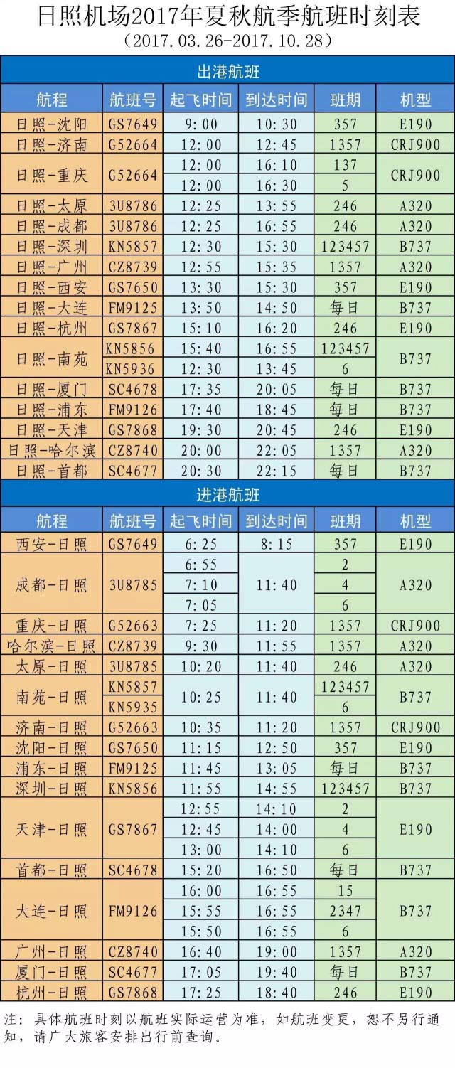 为方便广大旅客乘机,经与航空公司对接,日照机场2017年夏秋航季天津-日照航班时刻调整为每周二的GS7867航班,天津至日照段时间变更为12:55天津起飞,14:10日照落地,其他时刻不变。