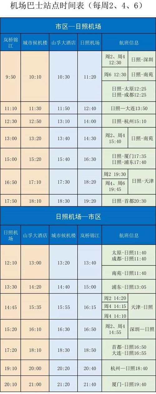 从4月29日开始成都=太原=日照航线航班时刻调整了 从5月1日开始天津=日照=杭州航线航班时刻调整了 自2017年4月29日起,成都至日照航段每周六时间变更为07:10成都起飞(延后5分钟); 自2017年5月1日起,天津=日照航班时刻有所微调(延后5-20分钟),其中天津至日照段每周二时间变更为13:05天津起飞,14:20日照落地,每周四变更为13:00天津起飞,14:15日照落地;GS7868航班,日照至天津航段每周四、周六时间变更为19:45日照起飞,21:05天津落地,其他时刻不变。 现将2017.5.1日起的航班时刻和机场巴士时刻附后。