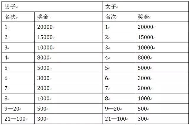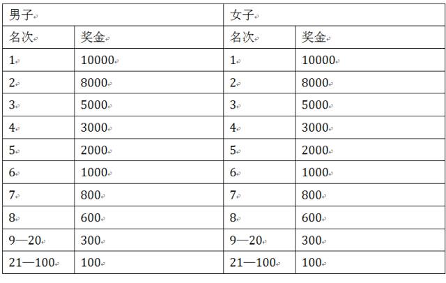 总成绩男子第1—100名的选手(按净计时成绩录取)、女子第1—100名的选手(按净计时成绩录取),分别获得奖金如下: